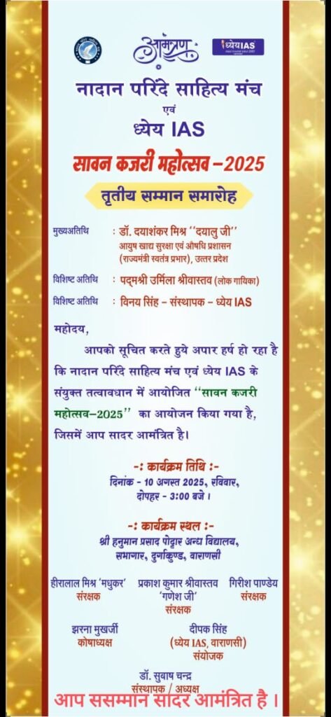 नादान परिंदे साहित्य मंच और ध्येय IAS के संयुक्त तत्वावधान में सावन कजरी महोत्सव 2025 का आयोजन आगामी 10 अगस्त को श्री हनुमान प्रसाद पोद्दार अंध विद्यालय,सभागार, दुर्गाकुंड, वाराणसी में होगा , कार्यक्रम के मुख्य अतिथि राज्य मंत्री स्वतंत्र प्रभार उत्तर प्रदेश डॉ. दया शंकर मिश्र “दयालु जी” व विशिष्ट अतिथि द्वय क्रमशः पद्मश्री उर्मिला श्रीवास्तव (लोक गायिका) विनय सिंह IAS होंगे। कार्यक्रम सम्बन्धी इस आशय की जानकारी नादान परिंदे साहित्य मंच के संस्थापक अध्यक्ष डॉ. सुबाष चंद्र ने दी है।